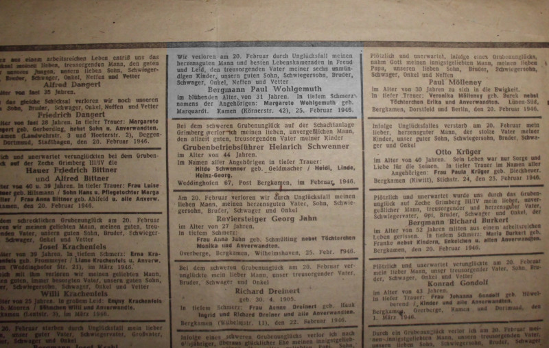 Ausschnitt aus der Tageszeitung mit Todesanzeigen - im Besitz des Knappenvereins Südkamen